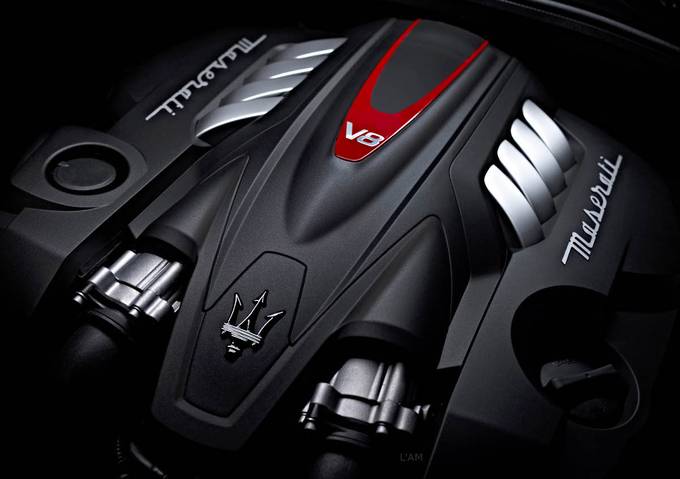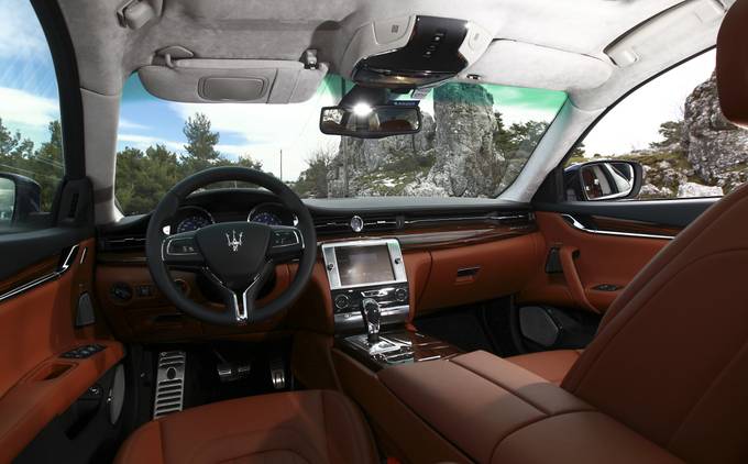 Les portes sans cadres, avec les trois vitres latérales et le montant arrière triangulaire, caractéristique du style Maserati, donnent à la voiture une allure de coupé malgré son grand empattement.